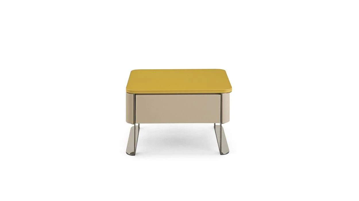 Bedside table with 1 drawer structure in lacquered MDF or in veneered Alpi® (reconstitute veneer) with a top in a choice of matte lacquer, lacquered glass, Alpi veneer or ceramic. Legs in black chrome-plated steel.
