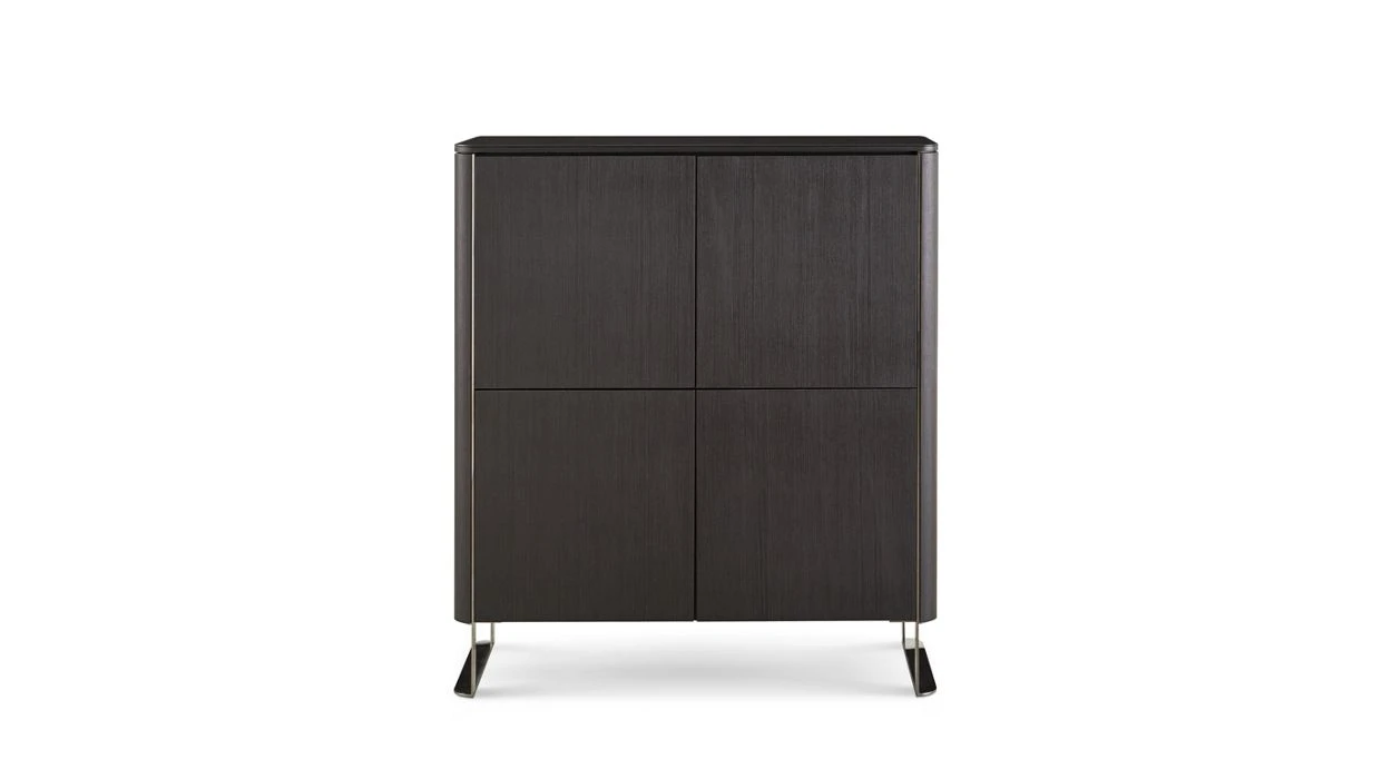 China unit with 4 doors, structure in lacquered MDF or in veneered Alpi® (reconstitute veneer) with a top in a choice of matte lacquer, lacquered glass, Alpi veneer or ceramic. Legs in black chrome-plated steel.