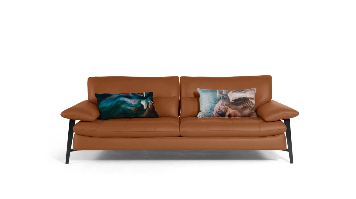 Upholstered in solid Loft leather (thick. 1,9-2,1mm), full grain cowhide, pigmented. Double-depth backs with rocking mechanism, HR foam 21 kg/m³ and batting. Seat cushions in HR bi-density foam 35S-35 kg/m³ and fibres. Armrests cushions in HR foam 25S kg/m³ and fibres. Structure in solid fir wood, pine plywood and engineered composite wood. HR elastic straps suspension. Base in varnished metal with glossy Anthracite finish. Available in other dimensions.