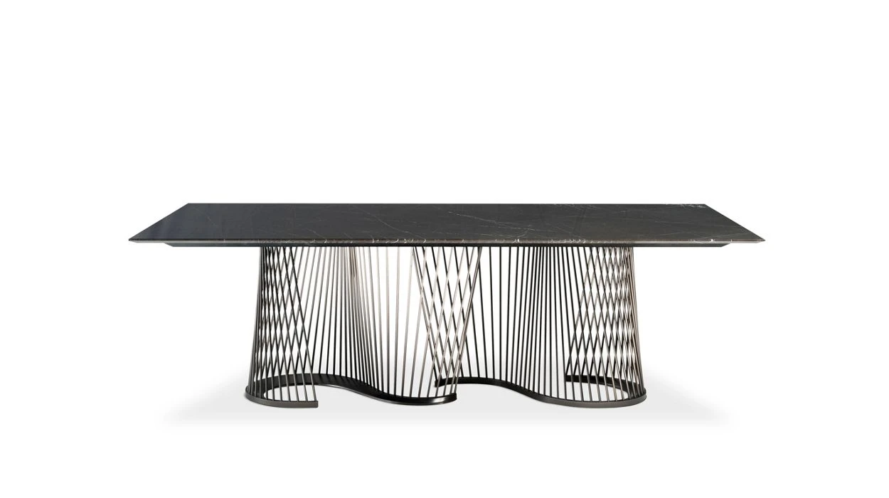 Dining table with base composed of 96 black chrome-plated steel tubes, arranged in a semi-circle on a satin-finished steel base. Top in marble (5 options available).