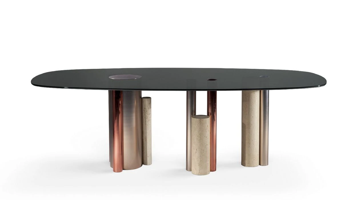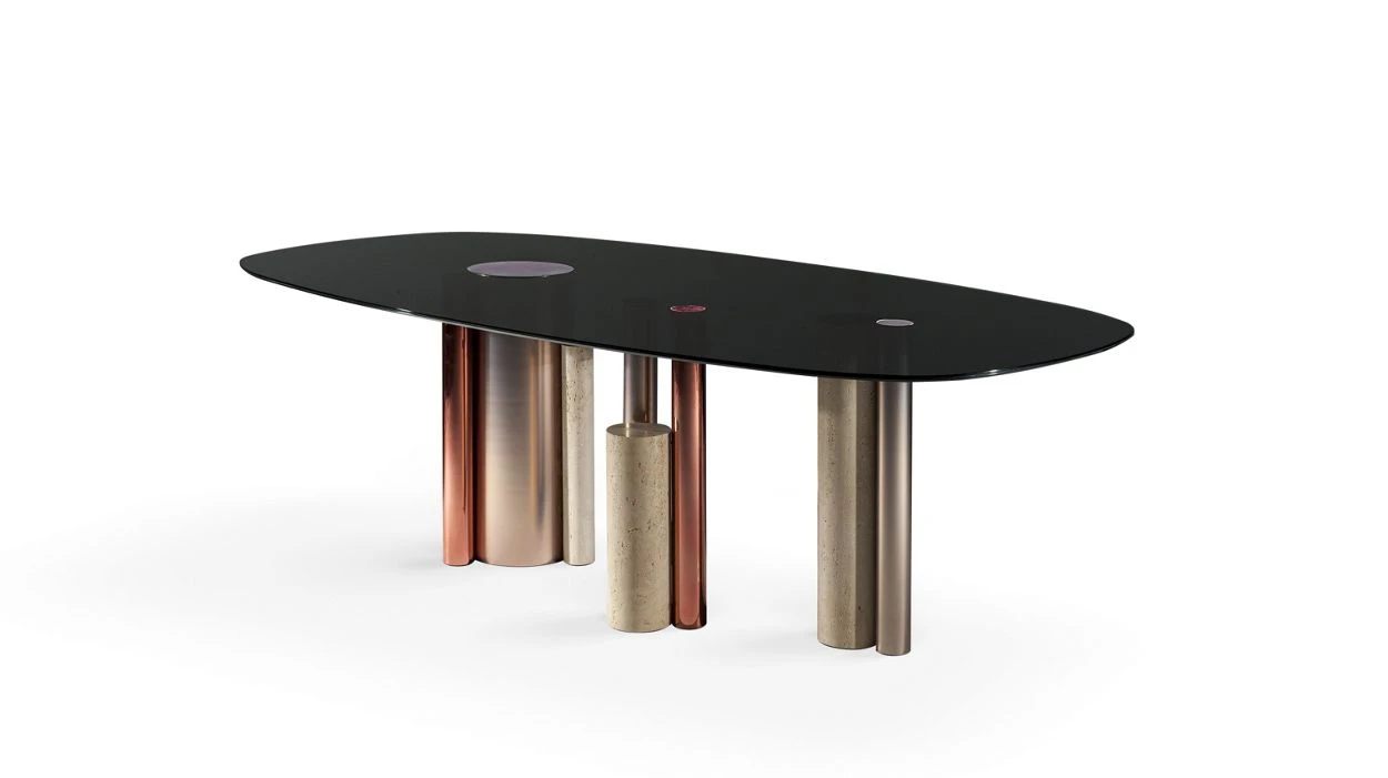 A balancing act punctuated by cylindrical shapes in varying diameters and heights, multiple materials and colours… The sculptural base playfully underpins the smoked glass top, sometimes piercing its surface. Travertin, Emperador and Marquina each dominate one of the three harmonious pillars.
