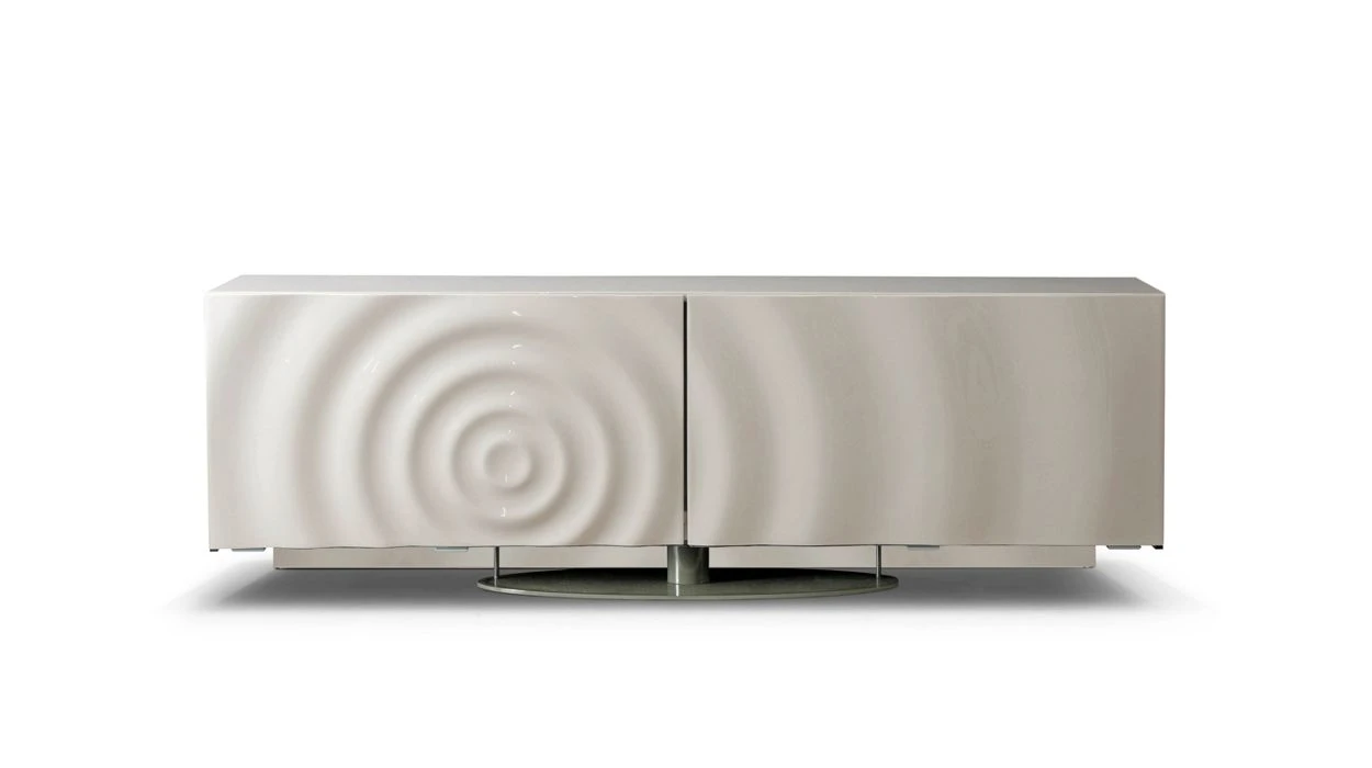 Sideboard, structure with matte lacquer finish, 2 sliding doors with thermo-formed relief with water-drop pattern in Krion®. Interior with 1 drawer and 1 tray in 8mm-thick clear glass. Base with epoxy lacquer finish.