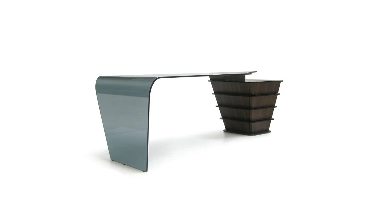 Top in 12 mm-thick curved smoked glass, col. grey. Chest of 4 drawers in lacquered MDF or smoked walnut Alpi veneer (reconstituted veneer). Fins in 12 mm-thick smoked glass. Cable duct and storage compartment with electric plugs.