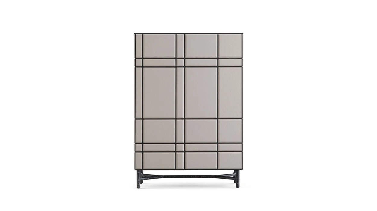 China cabinet with 2 doors, structure in MDF CARB2 with stained natural oak veneer. Interior with 4 shelves in 8mm-thick clear glass. Front and sides in TENDRESSE leather (many colours available). Joints and base in solid oak (many stains available).