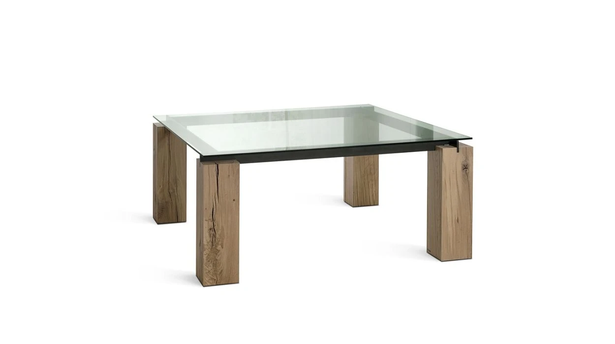 Dining table with 17x17cm base in solid oak or MDF veneer, finishes available: stained oak veneer (many stains available), natural walnut veneer with satin varnish finish, brown-stained walnut veneer with high gloss varnish finish. Top in 12mm-thick tempered glass, crossbars in metal with epoxy lacquer finish. Other dimensions available.
