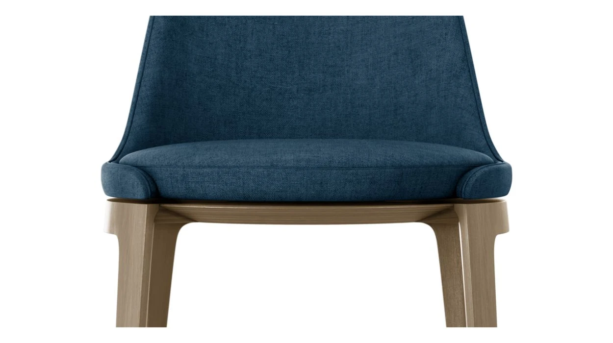 Chair with shell in plywood with foam 40, upholstered in fabric, leather-like fabric, or leather (many colours available). Matching piping (other colours available). Legs in stained oak veneer.