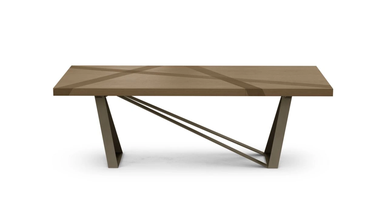 Designer Luigi Gorgoni was inspired by the work of craftsmen to create this collection. It features thick veneer with a series of diagonal grooves. This same design idea is also reflected in the base that is formed by 3 lacquered metal triangles. The grooves in the top hide the opening for the extension leaf.
