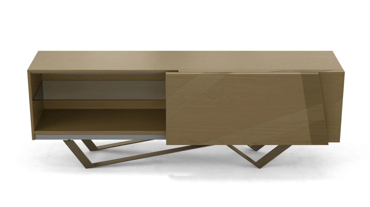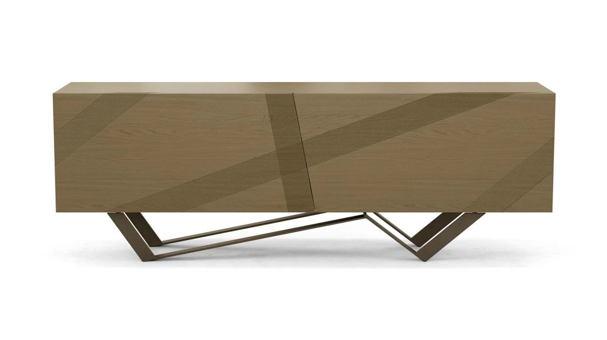 The sideboard is supported by a metal base that resembles a bolt of lightning and features two coplanar doors (meaning that each door can slide in front of the other), with the opening blended into the engraved decor.