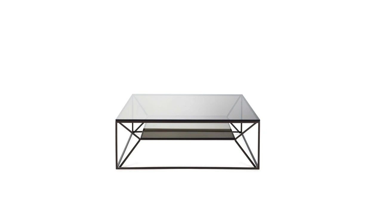 Cocktail table with two trays. Structure in lacquered metal, col. bronze. 10mm-thick upper tray and lower top in 8mm-thick glass.