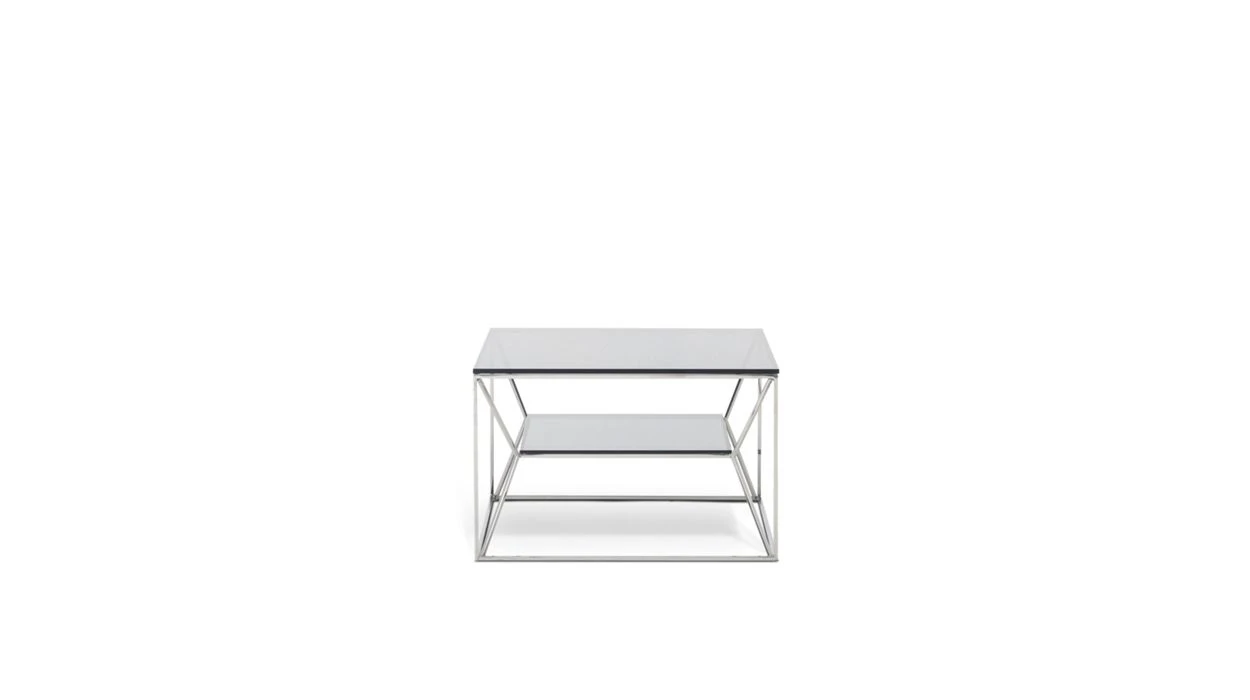 End table with two trays. Structure in chrome-plated metal, 12mm-thick upper tray and 8mm-thick lower tray in glass.