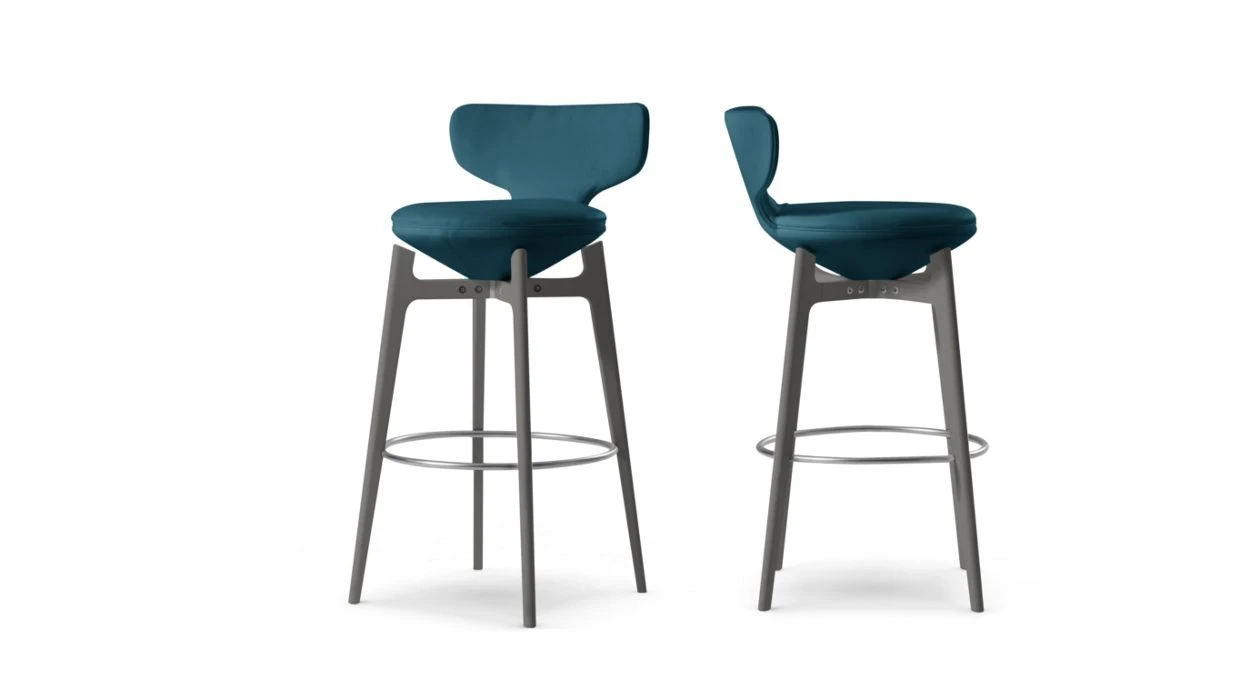 Large stool with back, without automatic return function, seat and back cushions filled with HR foam 65kg/m3, upholstered in fabric or leather-like fabric, footrest with chrome-plated satin finish and base in beech with beech or matte stain finish (many dimensions and colours available).
