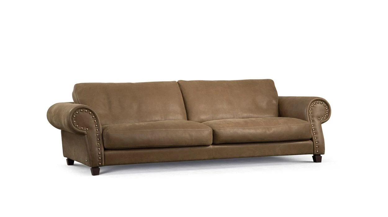 Upholstered in OLD RIVER leather, European bull hide, natural matte corrected grain with nubuck and aniline finish. Seat cushions with 100% feather duvet on 30CM foam core. Back cushions in 100% feathers. Armrests with metal nails with patina finish. Structure in beech, solid fir wood, poplar plywood and engineered composite wood. Cross-webbing elastic straps suspensions. Base in solid beech with Wenge stain finish.