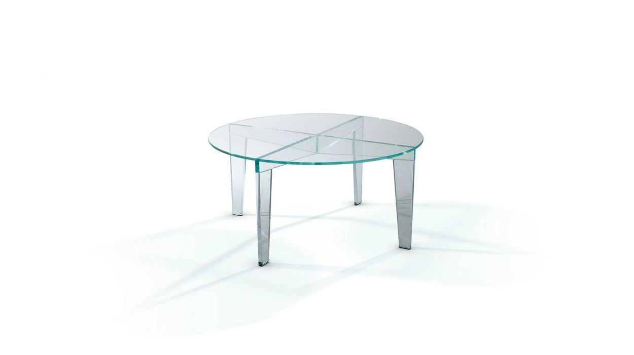 Round cocktail table in extra-clear glass, upper tray in 10mm-thick extra-clear glass and base in 19mm-thick glass.