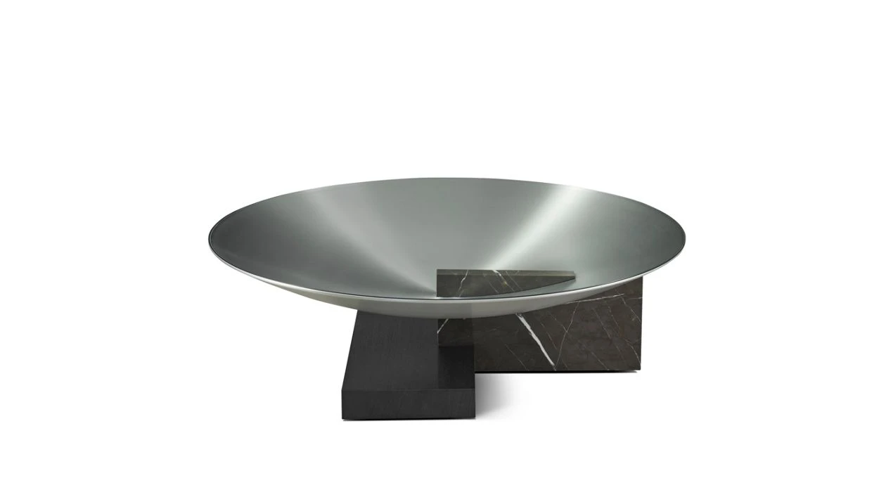 As a nod to Art Deco, this cocktail table was designed by Cédric Ragot as a composition of pure forms. A large hemispherical cup is supported by two recessed rectangular shapes (in various marbles or solid ash wood): one is horizontal to ensure stability, and the other is vertical and extends up through the bottom of the cup.