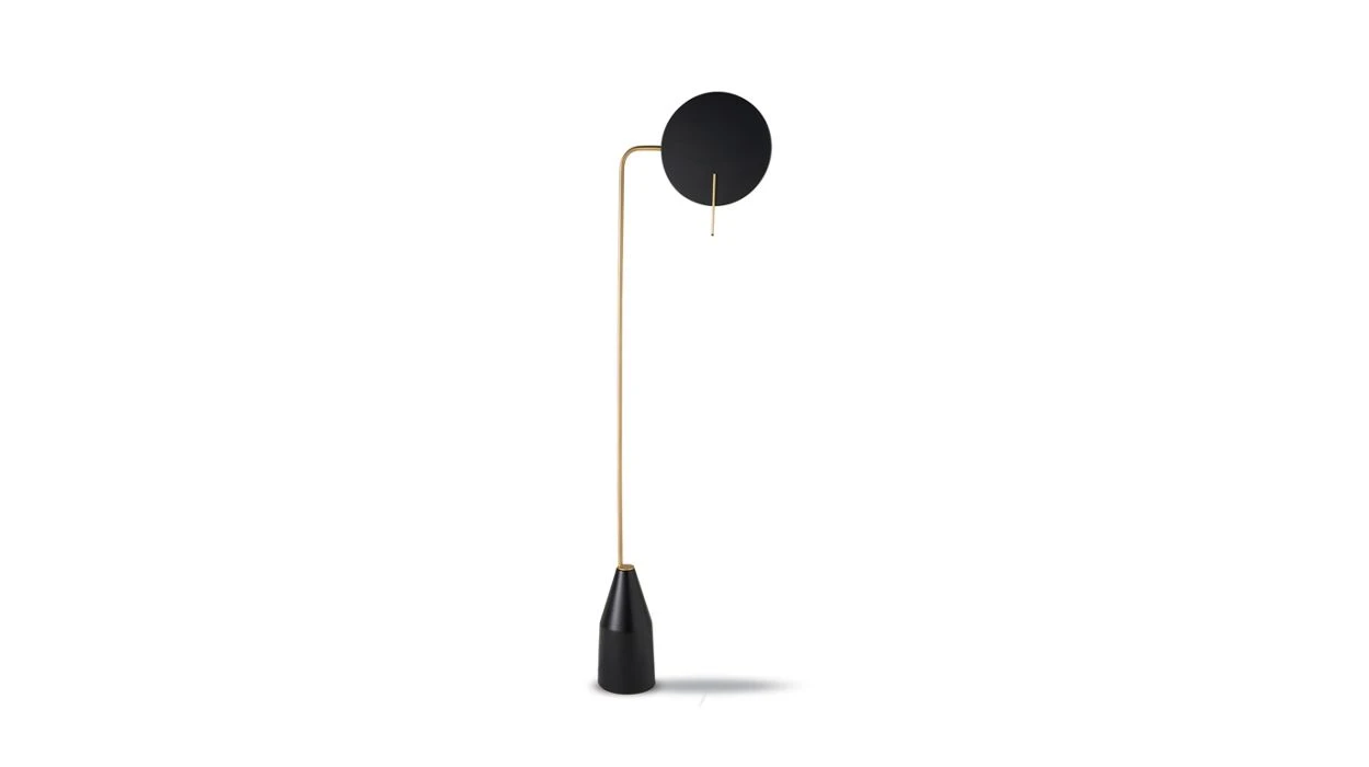 Floor lamp with metal structure in gold satin lacquer finish. Base and diffuser in metal, satin finish, black color. Touch switch on the metal bar for the diffuser, with dimmer. Diffuser rotates on a horizontal axis. Manufactured in Europe.