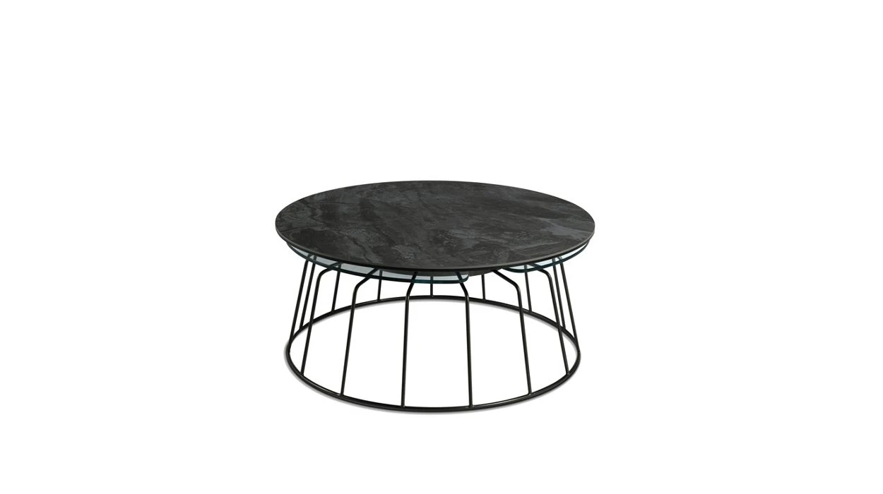 Structure in lacquered steel wire (many lacquer colours available), main top in 13mm-thick glass/ceramic (Pietra or Marmi) composite, 3 retractable tops in 10mm-thick natural glass.
