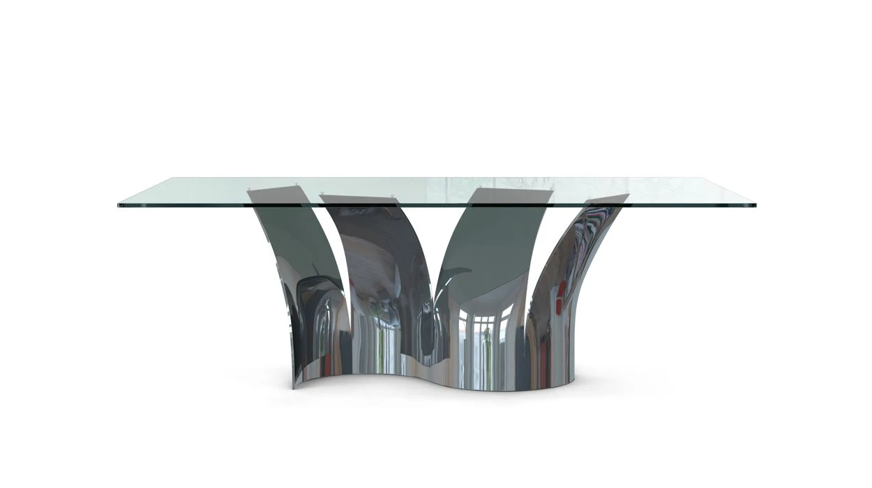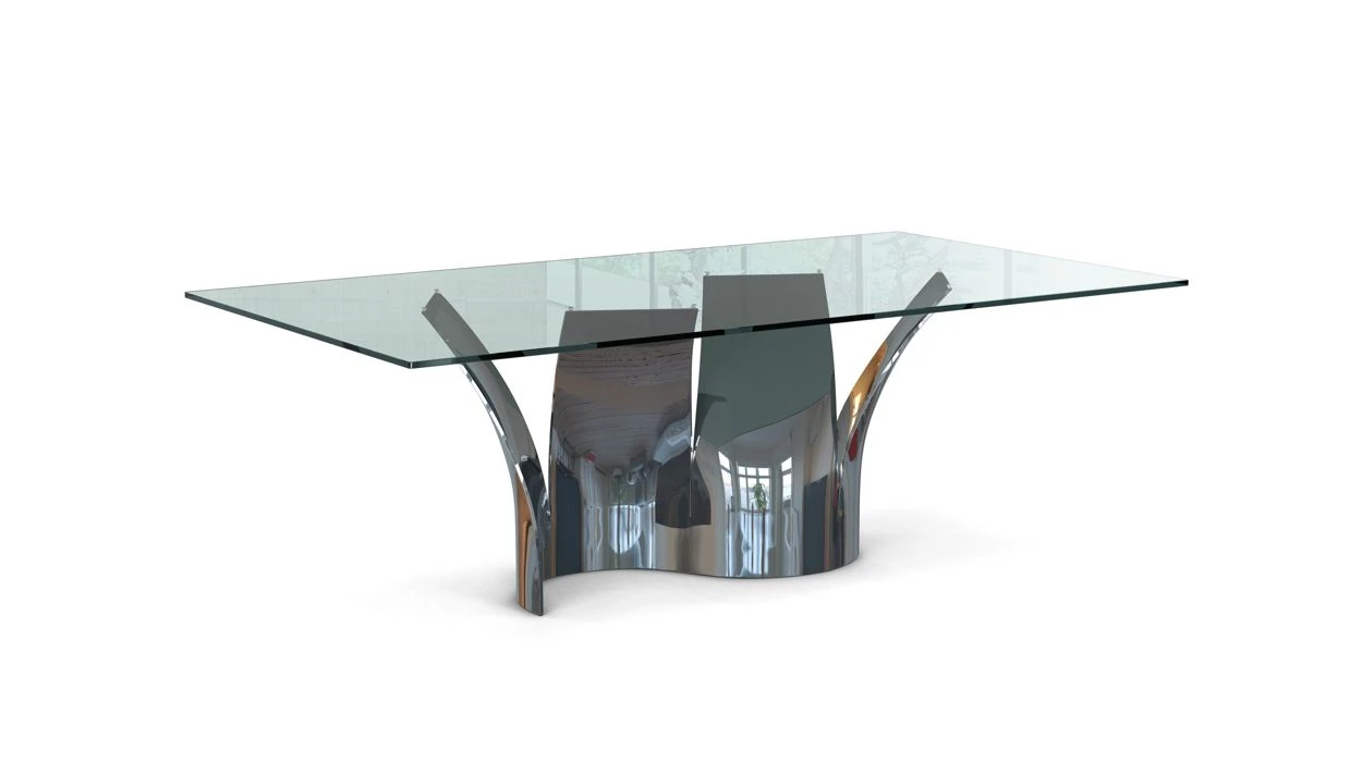 Three months of research in the workshop were necessary for designer-sculptor Maurice Barilone to obtain the aerial shape of these curved sheets that make up the base. They are cut, subjected to 1500 kg of pressure, welded together, and re-polished before adding the desired finish. The beauty of these pieces is the look of lightness that is created out of this thick metal. The reflections created by the galvanisation (available in gold, copper, chrome-plated, or black nickel finish) or the vibrant coloured chrome-plated finish give it a refined look.