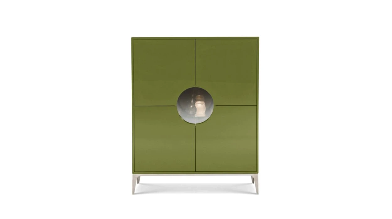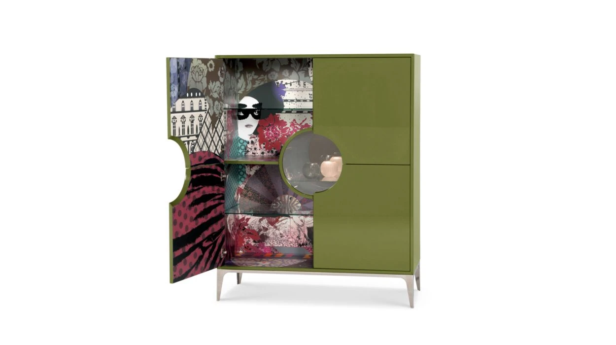Cabinet with 4 doors in MDF panels. Exterior with high gloss lacquer finish, interior with matte exclusive printed Artwork design or in high gloss exclusive printed Artwork design. Central display niche with lighting (2 finishes available) with remote control. Base in polished stainless steel (other finishes available).