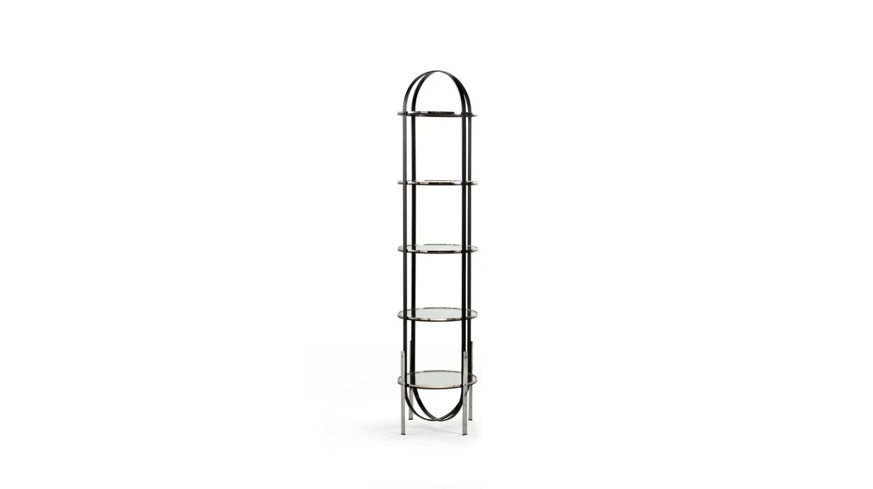 These three shelves feature two thin metal hoops that extend up to support the glass trays. These shelves are perfect for displaying precious objects.